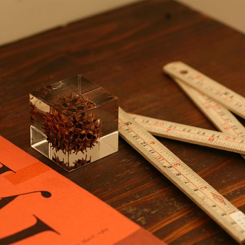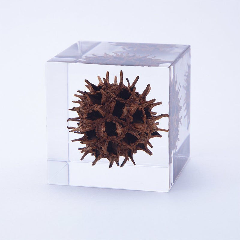 宙言葉:固い結束 日本へは大正時代に渡来してきた植物で、街路樹や公園木としても良く植えられています。 秋の紅葉は美しく、葉がモミジによく似ていることから、その名前が付けられました。でも実際はモミジの仲間ではありません。 トゲトゲの果実は、小さな実がたくさん集まった状態。果実は秋に乾いて開き、翼のついた種を風でとばします。 ■素材 アクリル樹脂、乾燥植物 ■サイズ D40mm × W40mm × H40mm ■重さ 74グラム ■ご注意点 ・Sola cube は1つ1つ職人が手作りしています。封入されている植物の大きさ、色、形はすべて異なります。 ・製造の工程上、内部に微細な気泡やチリ状のものが発生することがありますが、商品の不良ではありません。 ・温度の高い場所に長時間置くと、変形したり細かいクラック(ひび割れ)が入ることがあります。炎天下などの高温を避けてご使用ください。 ・シンナーやアルコールなどの溶液や薬品に触れると細かいクラック(ひび割れ)が入ることがあります。お手入れの際は柔らかい布で拭いてください。