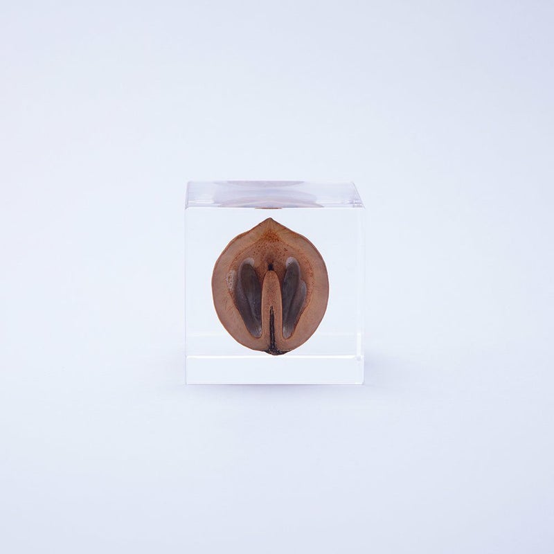 宙言葉:共存共栄 固い実の中身はリスの大好物。巣に運ばれた実は、ほとんど食べられてしまいますが、忘れられた実が春に芽を出します。オニグルミは、こうして遠くへ種を運んでいるのです。 通常知られているクルミよりも、殻が厚く、堅いのが特徴です。殻が非常に固いので、砕いてスタッドレスタイヤにまぜて、スリップ止めなどにも使われます。 キューブに収められているのは、殻を割って子葉を取り出した後の状態です。 ■素材 アクリル樹脂、乾燥植物 ■サイズ D40mm × W40mm × H40mm ■重さ 74グラム ■ご注意点 ・Sola cube は1つ1つ職人が手作りしています。封入されている植物の大きさ、色、形はすべて異なります。 ・製造の工程上、内部に微細な気泡やチリ状のものが発生することがありますが、商品の不良ではありません。 ・温度の高い場所に長時間置くと、変形したり細かいクラック(ひび割れ)が入ることがあります。炎天下などの高温を避けてご使用ください。 ・シンナーやアルコールなどの溶液や薬品に触れると細かいクラック(ひび割れ)が入ることがあります。お手入れの際は柔らかい布で拭いてください。