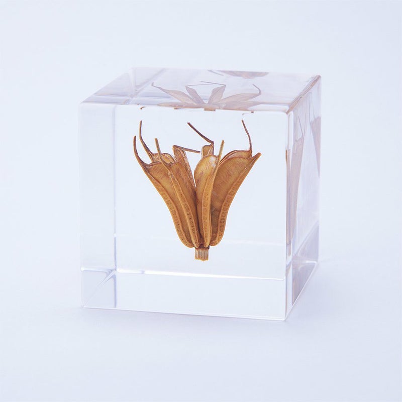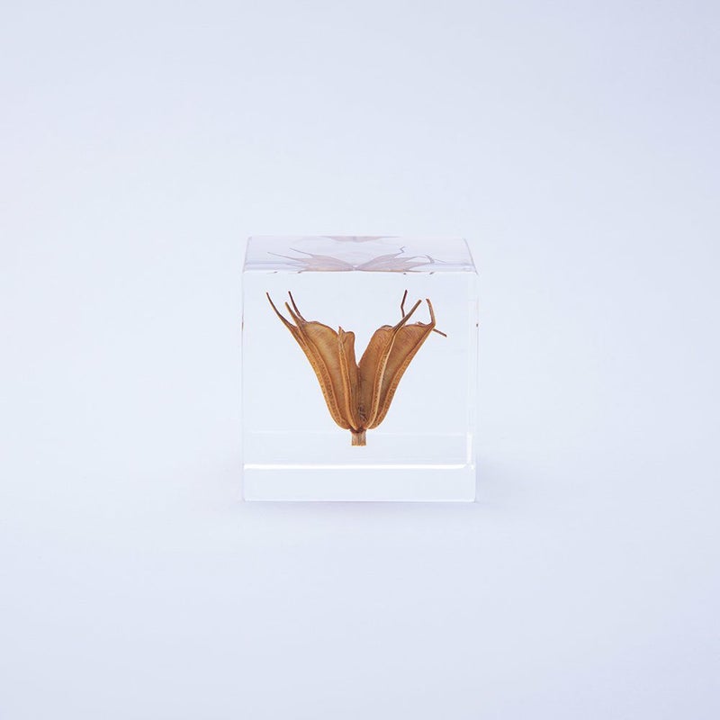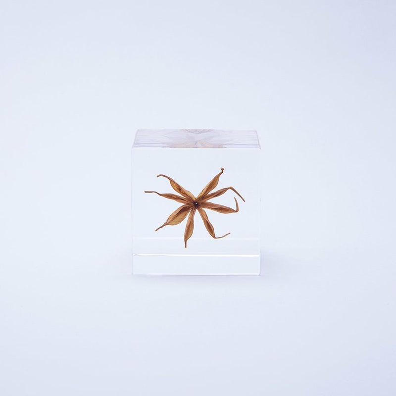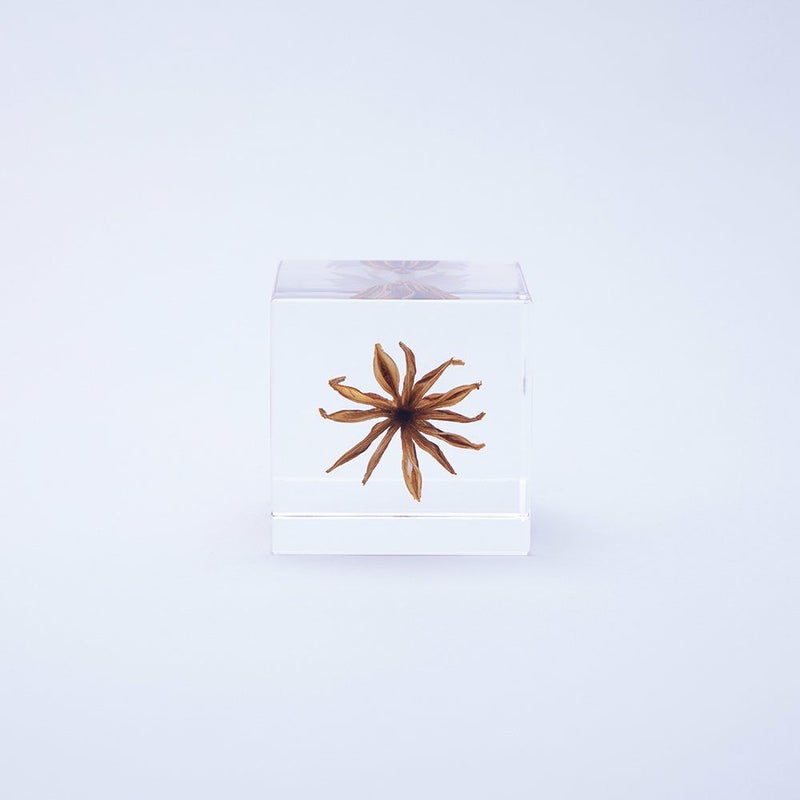 宙言葉:甘い誘惑 「さく果」と呼ばれる果実は、乾燥すると割れて、中の種を外に出します。 イスラムの世界では、その種子を古くから薬として。ヨーロッパでは、お菓子の香料として使われていました。 果実の先の尖った部分は、雄しべのなごり。花言葉は「夢の中の恋」です。 ■素材 アクリル樹脂、乾燥植物 ■サイズ D40mm × W40mm × H40mm ■重さ 74グラム ■ご注意点 ・Sola cube は1つ1つ職人が手作りしています。封入されている植物の大きさ、色、形はすべて異なります。 ・製造の工程上、内部に微細な気泡やチリ状のものが発生することがありますが、商品の不良ではありません。 ・温度の高い場所に長時間置くと、変形したり細かいクラック(ひび割れ)が入ることがあります。炎天下などの高温を避けてご使用ください。 ・シンナーやアルコールなどの溶液や薬品に触れると細かいクラック(ひび割れ)が入ることがあります。お手入れの際は柔らかい布で拭いてください。