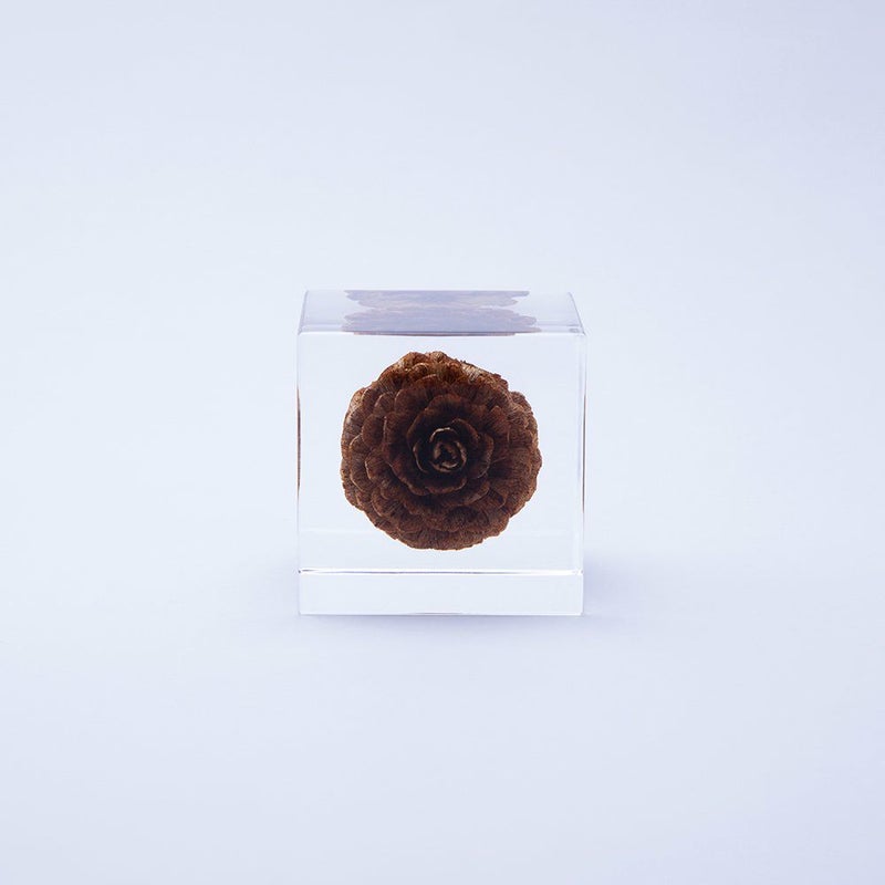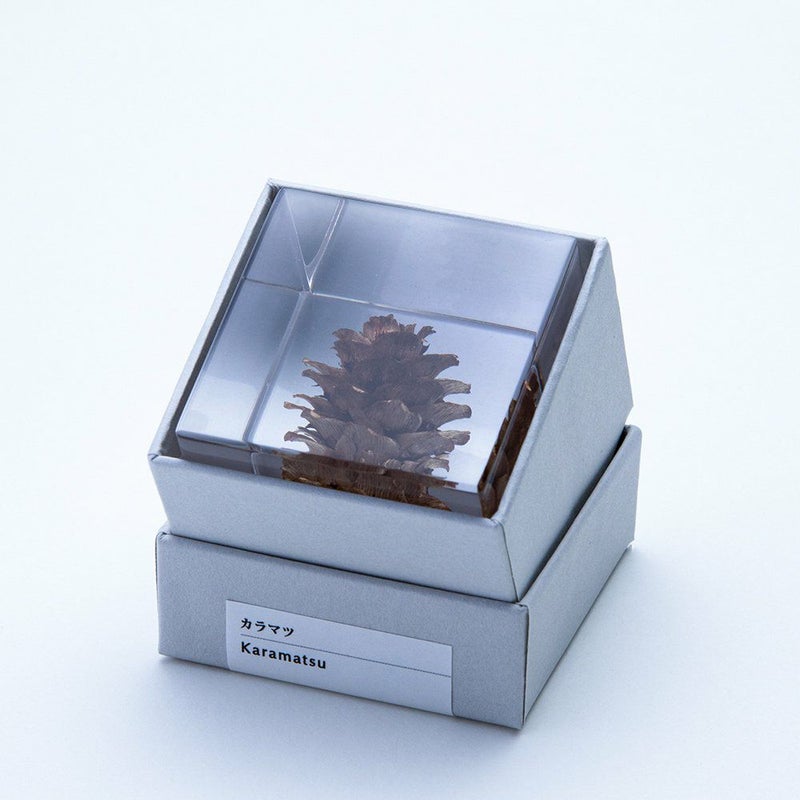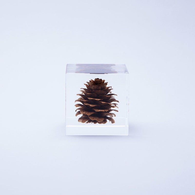 宙言葉:反骨精神 葉のつき方が中国の絵画(唐絵)のマツに似ていることが名前の由来です。マツカサの鱗片は乾燥すると先端が反り返って開き、間にはさまっている種を飛ばします。 ■素材 アクリル樹脂、乾燥植物 ■サイズ D40mm × W40mm × H40mm ■重さ 74グラム ■ご注意点 ・Sola cube は1つ1つ職人が手作りしています。封入されている植物の大きさ、色、形はすべて異なります。 ・製造の工程上、内部に微細な気泡やチリ状のものが発生することがありますが、商品の不良ではありません。 ・温度の高い場所に長時間置くと、変形したり細かいクラック(ひび割れ)が入ることがあります。炎天下などの高温を避けてご使用ください。 ・シンナーやアルコールなどの溶液や薬品に触れると細かいクラック(ひび割れ)が入ることがあります。お手入れの際は柔らかい布で拭いてください。