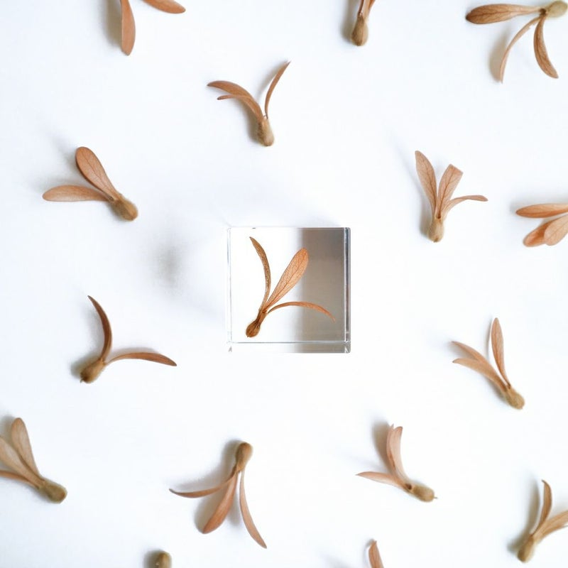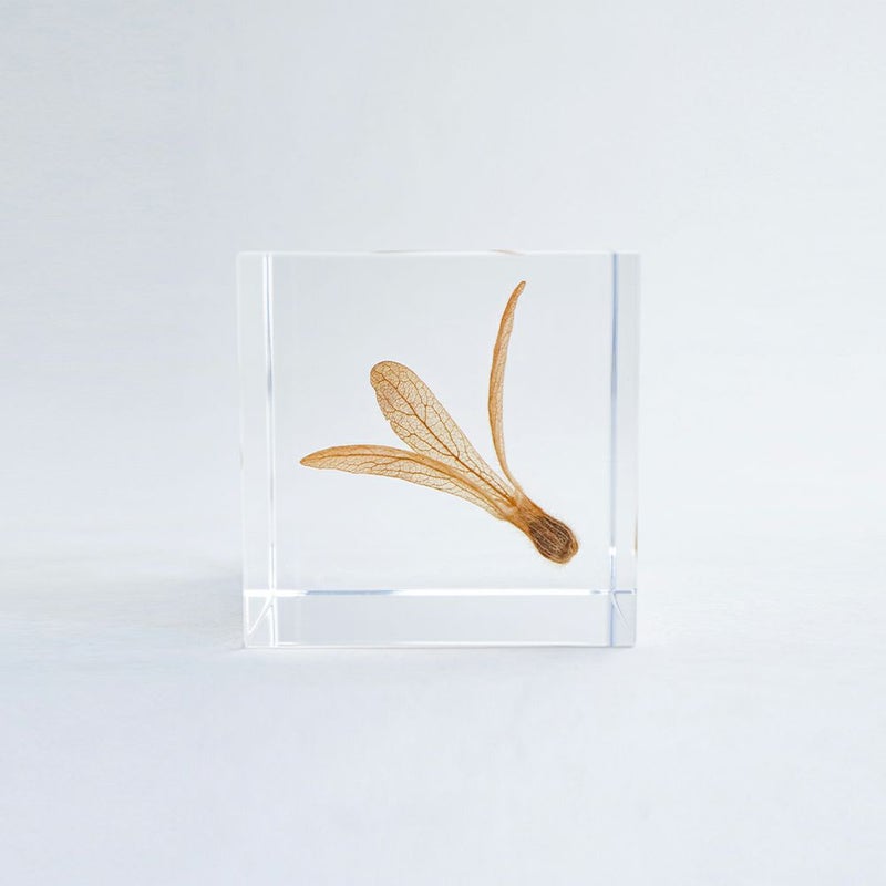 宙言葉:流れをつかむ 果実の特徴的な羽は、萼片(がくへん)が変化したもので、風で種子を運ぶ工夫のひとつです。 高いところから落とすと、くるくると回転しながら落ちていきます。 熱帯アメリカ原産の木で、樹液をエサにしてアリを棲まわせることで、外敵から自身を守っています。 監修:公益財団法人高知県牧野記念財団 ■素材 アクリル樹脂、乾燥植物 ■サイズ D40mm × W40mm × H40mm ■重さ 74グラム ■ご注意点 ・Sola cube は1つ1つ職人が手作りしています。封入されている植物の大きさ、色、形はすべて異なります。 ・製造の工程上、内部に微細な気泡やチリ状のものが発生することがありますが、商品の不良ではありません。 ・温度の高い場所に長時間置くと、変形したり細かいクラック(ひび割れ)が入ることがあります。炎天下などの高温を避けてご使用ください。 ・シンナーやアルコールなどの溶液や薬品に触れると細かいクラック(ひび割れ)が入ることがあります。お手入れの際は柔らかい布で拭いてください。