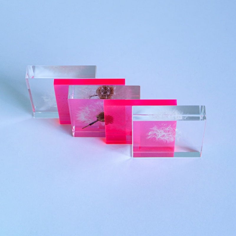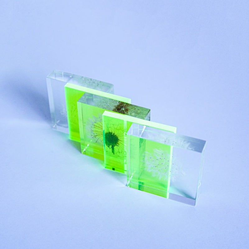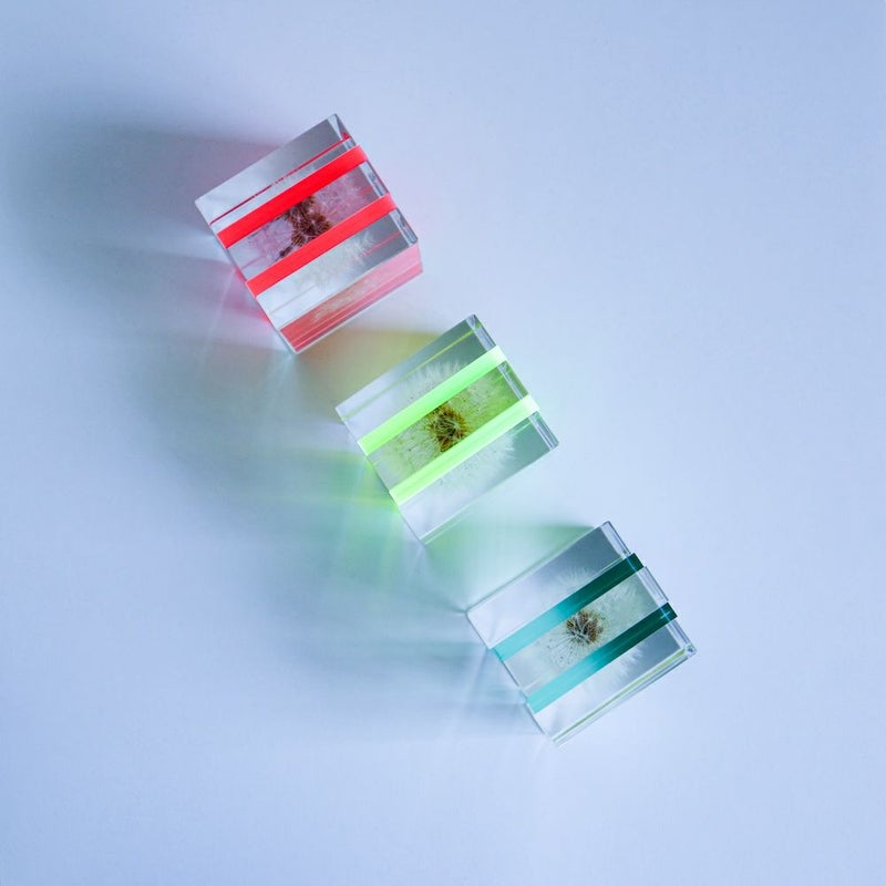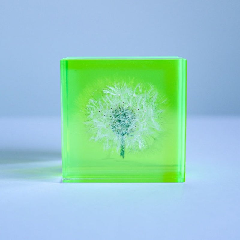 商品基準に満たなかった5cm角のタンポポを3枚にスライスし、アクリル板を挟むことで生まれ変わったSola cube Slice。